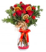 Yılbaşının büyülü atmosferini en zarif haliyle sevdiklerinize sunmak ister misiniz? Damla Cam Vazoda Kokina ve Kırmızı Gül aranjmanı, kokinaların umut dolu kırmızısı ile güllerin romantik dokusunu bir araya getirdi. Kozalakların ve kurutulmuş limonların doğal detaylarıyla süslenen bu özel çiçek şöleni, yılbaşına özgü sıcak bir ambiyans oluşturarak en özel başlangıçları unutulmaz kılacak!